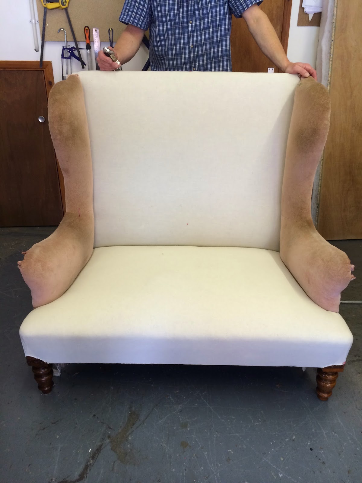 Almost ready! The love seat waiting for Charlie to put the casters on.